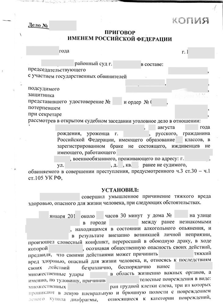 Тем не менее уголовное дело была направленно в суд именно с квалификацией действий моего доверителя через ч.3 ст.30 ч.1 ст.105 Уголовного Кодекса РФ, т.е. покушение на убийство. Более 9 месяцев рассматривалось уголовное дело в суде. Суд по инициативе адвоката предоставил возможность допросить ему ранее не известных следствию свидетелей, добиться назначения ряда судебно-медицинских и криминалистических экспертиз. Итогом работы адвоката стал приговор суда в котором действия подзащитного с покушения на убийство предусмотренного ч.3 ст.30 ч.1 ст.105 Уголовного Кодекса РФ были переквалицированы на ч. 1 ст. 111 Уголовного кодекса РФ - причинение тяжкого вреда здоровью. Указанная переквалификация Судом действий подсудимого естественно положительно для стороны защиты отразилась на назначенном наказании, так как верхний предел за преступление предусмотренное ч.3 ст.30 ч.1 ст.105 УК РФ предусматривает максимальное наказание в соответствии с правила назначения наказаний 11 лет и 2.5 месяца, а за преступление предусмотренное ч. 1 ст.111 Уголовного кодекса РФ, в совершении которого подсудимый признавал себя виновным и активно способствовал раскрытию и расследованию преступления, назначенное наказание не могло превышать верхнего предела 5 лет и 3 месяца.