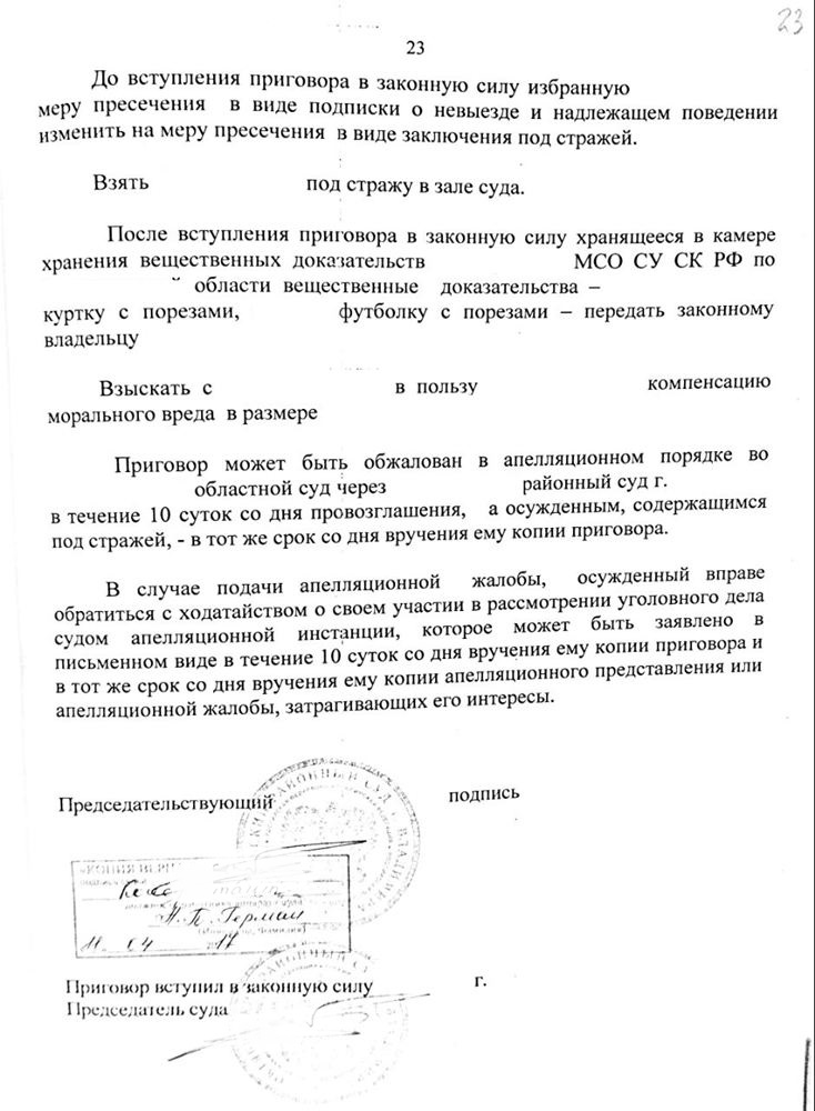 В соответствии с приговор доверитель был осужден на 2 года лишения свободы, материальный и моральный иск оставлен судом без рассмотрения.